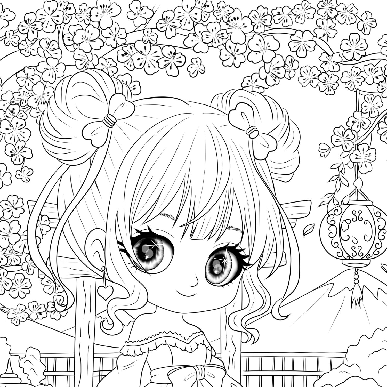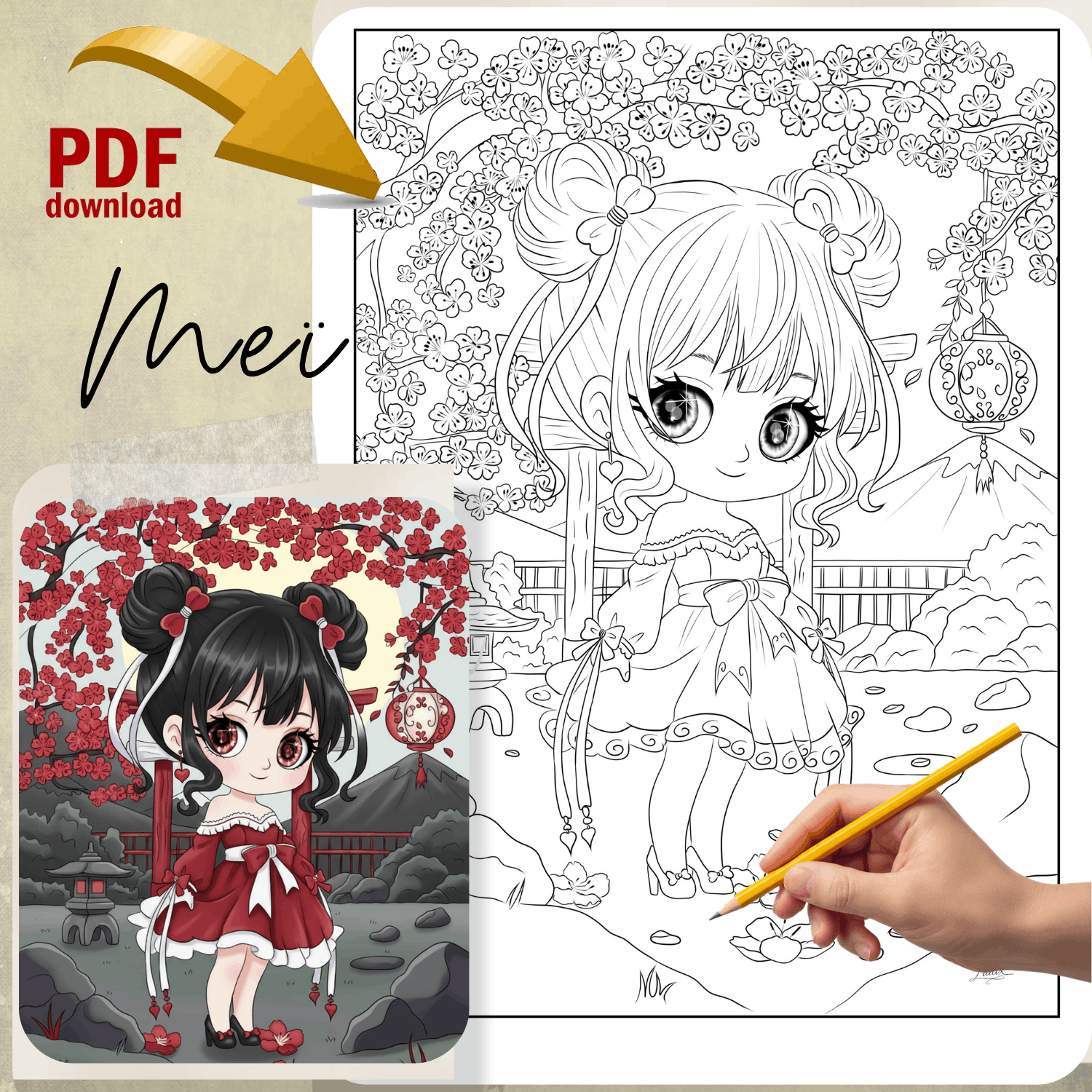 Plongez dans un univers de douceur et de sérénité avec ce coloriage original mettant en scène la petite Meï, une adorable jeune fille au style "chibi" voyageant au cœur du Japon traditionnel.